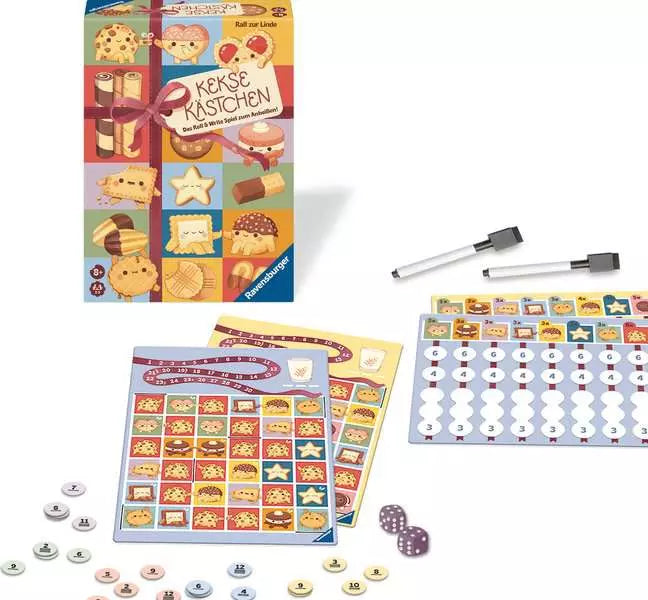 In Cookie Party tutti giocano contemporaneamente: i dadi e i gettoni numerati determinano dove possono essere disegnati i muri sul tabellone. Se un biscotto viene completamente circondato, può essere spuntato. L'obiettivo è quello di superare in astuzia i propri avversari e spuntare tutti i biscotti di un determinato tipo, poiché questo fa guadagnare molti punti. Il primo giocatore che colleziona il numero di punti richiesto vince questo divertente e coinvolgente gioco Roll & Write. Grazie alle plancia di gioco laminata a doppia faccia e alle penne cancellabili, il gioco può essere giocato tutte le volte che si desidera e offre molta varietà in due versioni emozionanti.