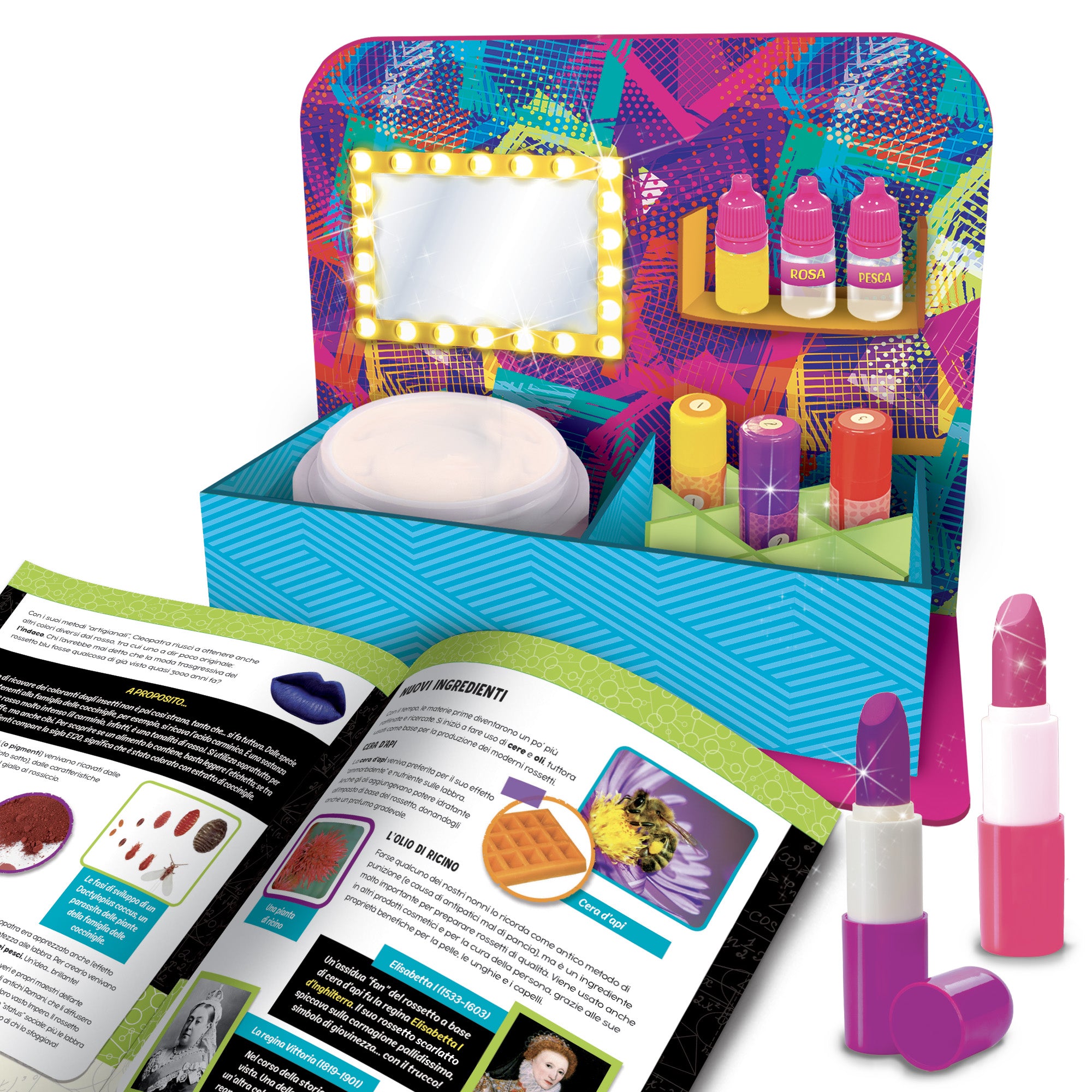 Con questo kit scientifico potrai creare tanti rossetti per le tue labbra: colorati, profumati e del tutto sicuri! Nella confezione troverai tutto l'occorrente per realizzarli: una base cremosa in cui sciogliere gli aromi profumati e i coloranti naturali, gli attrezzi per mescolare gli ingredienti e i tubetti girevoli da personalizzare con il nome dei tuoi nuovi rossetti! In più, una manuale illustrato che ti che ti spiega passo passo come fare.
