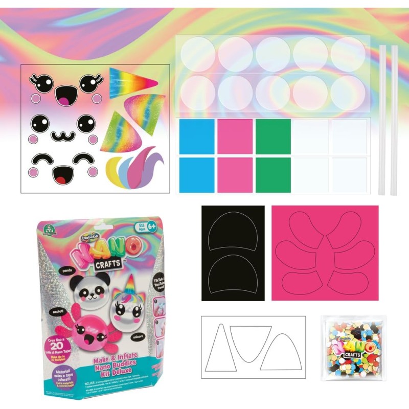 Ampia Creatività Questo set speciale consente di creare fino a 20 bolle di nano tape inclusi 3 simpatici animaletti gonfiabili utilizzando una varietà di materiali per personalizzare e arricchire le creazioni. Aggiunge ulteriori possibilità di creazione e personalizzazione con nano tape colorati set di orecchiette speciali in gommapiuma e stickers per aggiungere dettagli ai personaggi Componenti Inclusi Il set comprende 20 pezzi di nano tape pre tagliati di cui 6 colorati per una maggiore varietà 2 cannucce per facilitare l applicazione un sacchetto da 1g di stelline per decorazioni luminose un set di 7 stickers e un set da 11 componenti in gommapiuma come orecchiette. Facile da Utilizzare Include istruzioni dettagliate per guidare passo dopo passo nella creazione delle bolle rendendo il processo accessibile e divertente per tutte le età. Perfetto per Regali Creativi Ideale come regalo per chi ama il crafting e la personalizzazione questo set offre un esperienza creativa e interattiva che stimola la fantasia e la manualità.