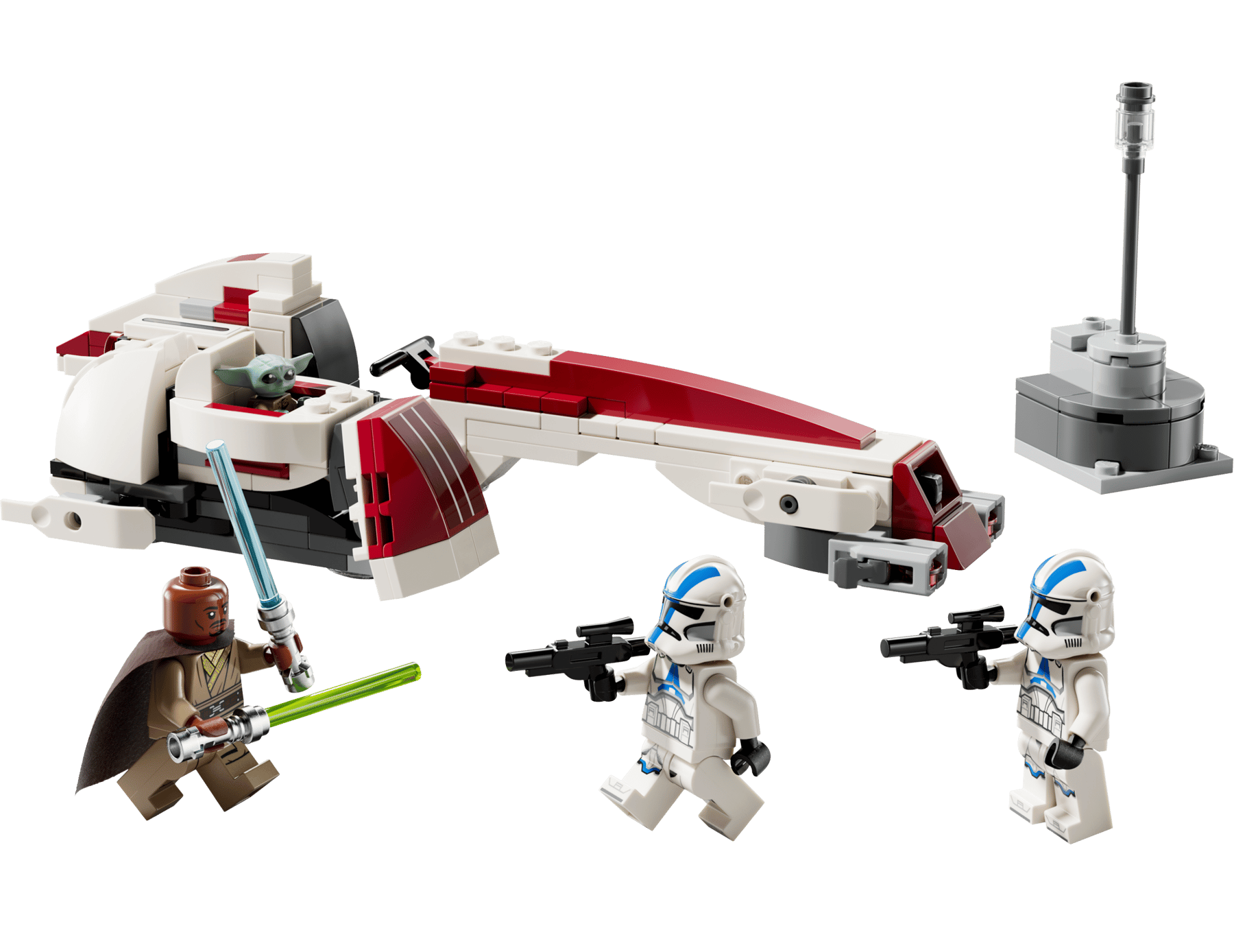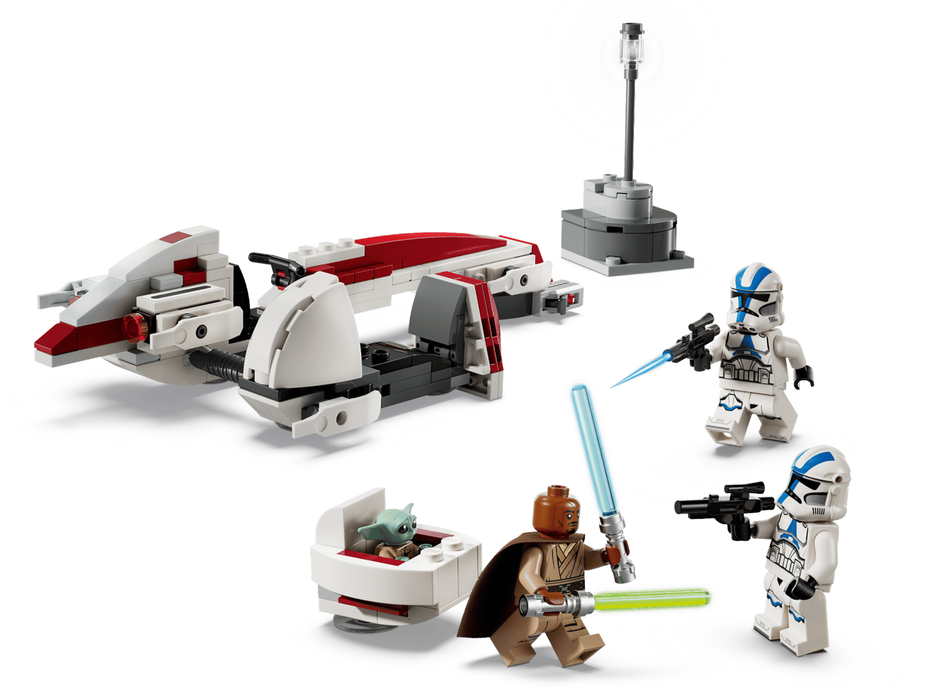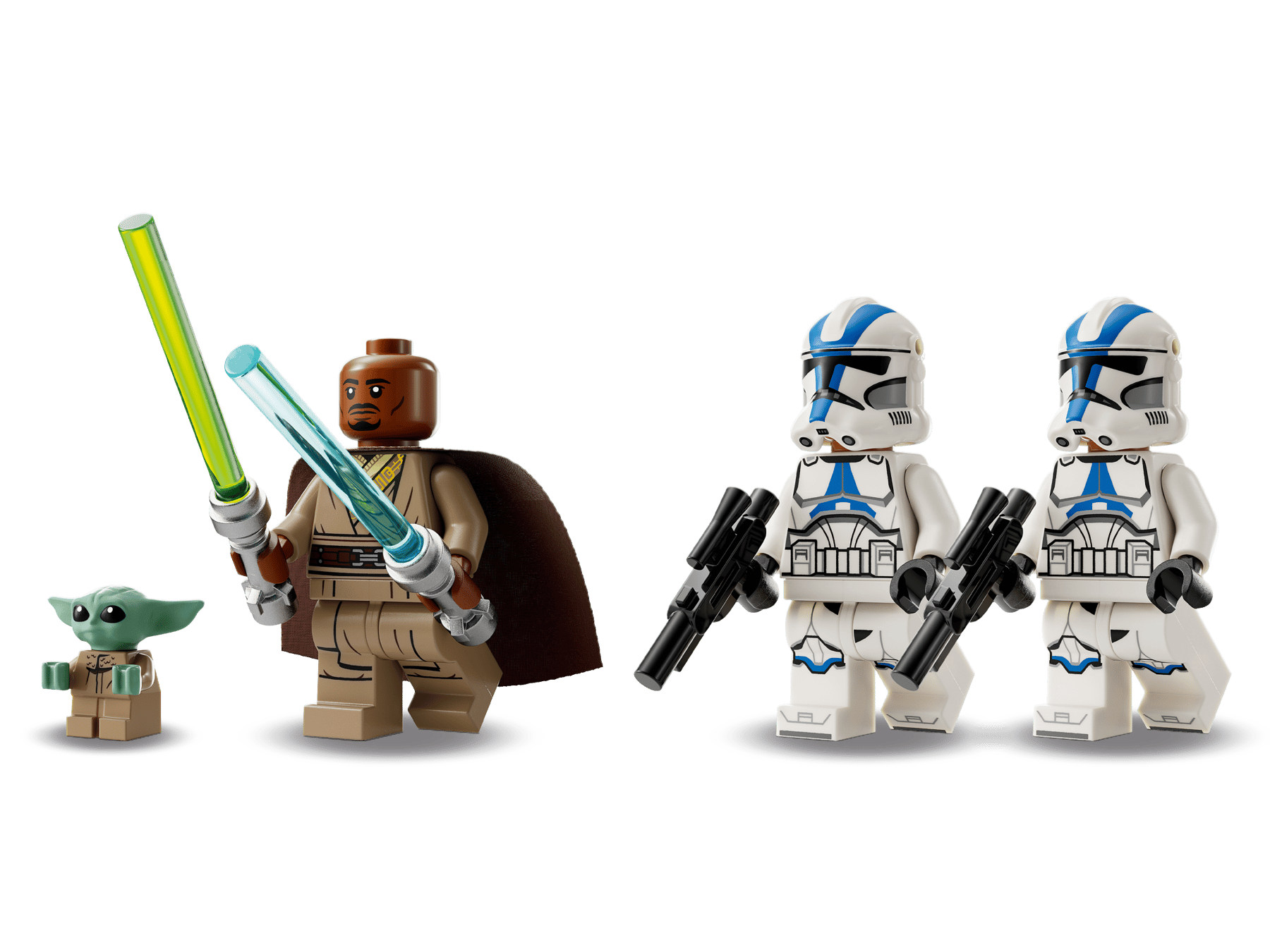 - 3 minifigure LEGO® Star Wars™ più Grogu: Kelleran Beq con spade laser blu e verdi e 2 Trooper Legione 501, ciascuno con blaster, più il personaggio LEGO di Grogu