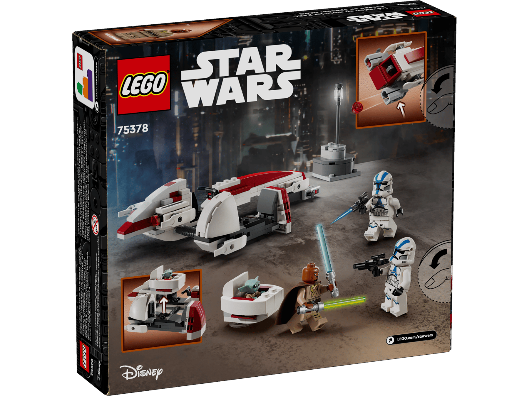 - Speeder BARC LEGO® Star Wars™ con sidecar: con questo set costruibile, i fan di Star Wars: The Mandalorian possono ricreare l’audace scena flashback della fuga dello Speeder BARC della Stagione 3