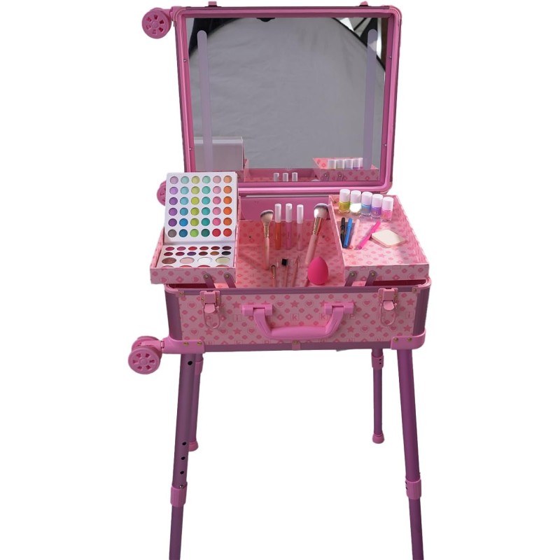 PINK IT STATION MAKE UP è una valigia porta trucchi con specchio illuminato scomparti richiudibili set completo di trucchi e con pennelli professionali dotato di gambe telescopiche regolabili e maniglia estraibile che può fare da supporto per vassoio porta pennelli e accessori USO le bambine si divertiranno a truccarsi il volto e le unghie delle mani creando nuovi look con il set di trucchi in dotazione imparando ad abbinare i colori degli ombretti e dei lucidalabbra e seguendo i consigli fashion che saranno suggeriti dalle mode di tendenza CONTENUTO 1 valigia con scomparti in cui si possono suddividere i trucchi in dotazione ovvero ombretti blush fard matite smalti rossetti pennelli applicatori spugnetta DIMENSIONI L 47 x A 39 x P 22 cm Prodotto Originale PINK IT by Nice Group.