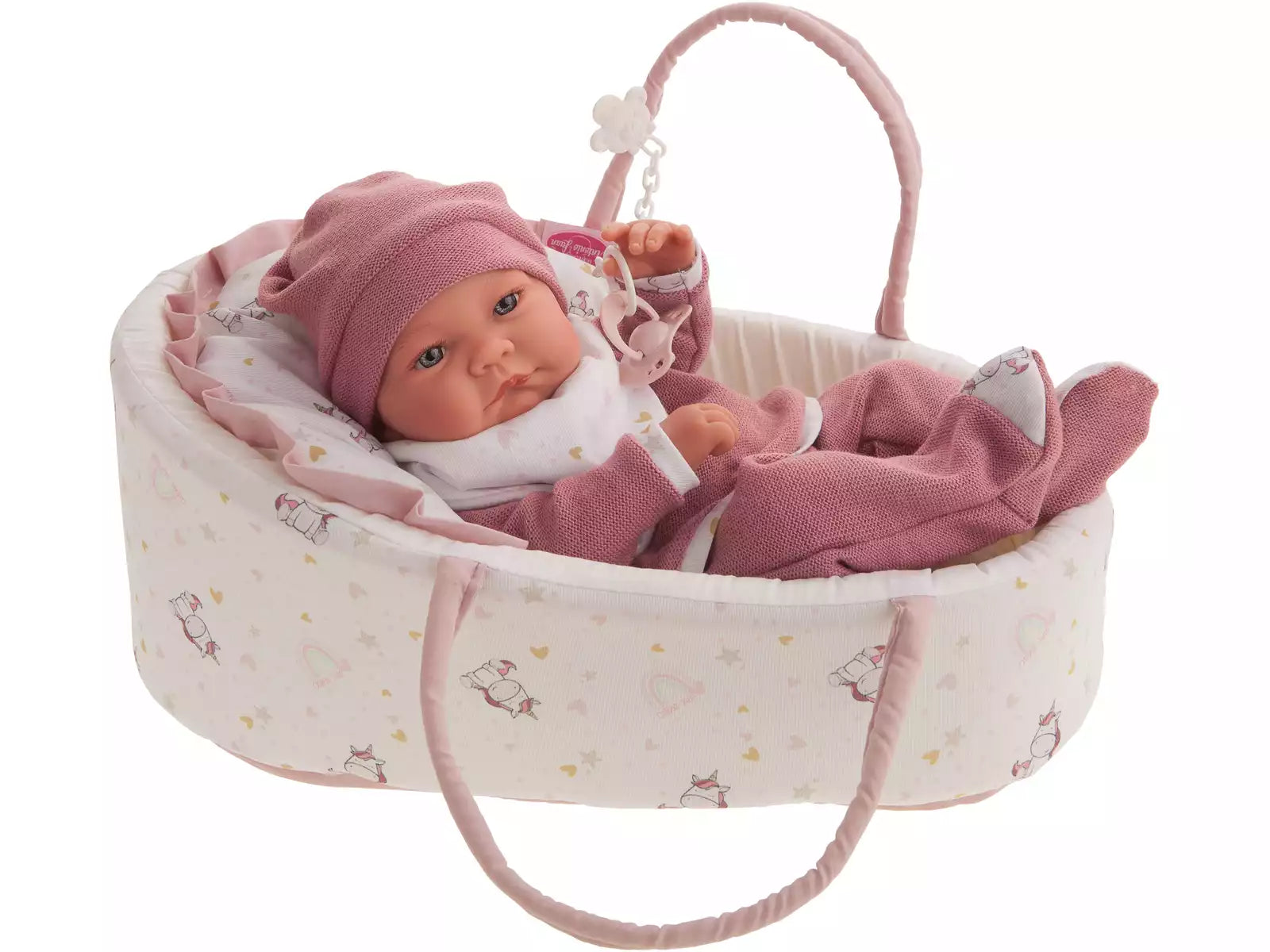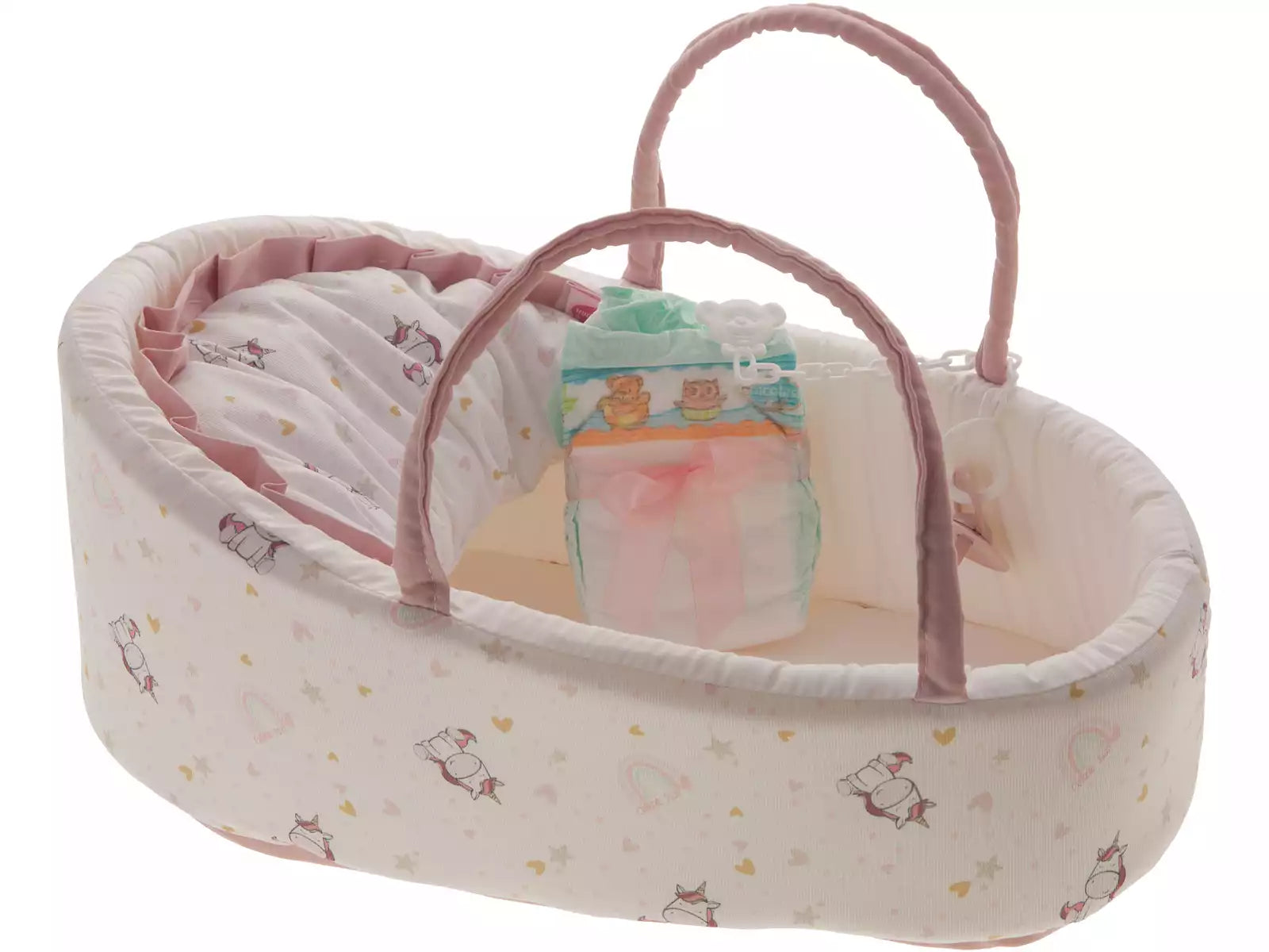 Include: 1 navicella bianca con unicorni, cuori e stelle, 1 ciuccio con attacco, 1 cuscino e 1 pannolino per Bambola.