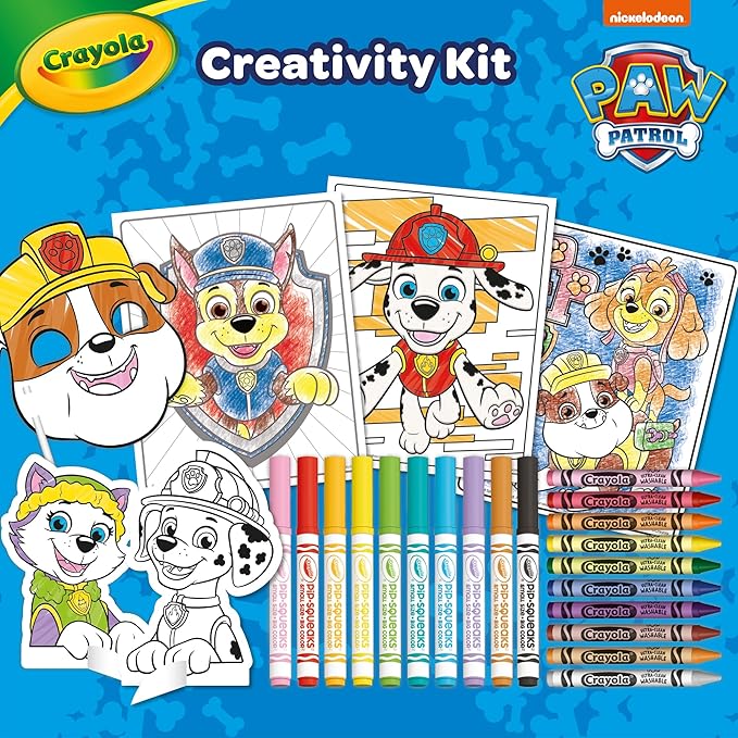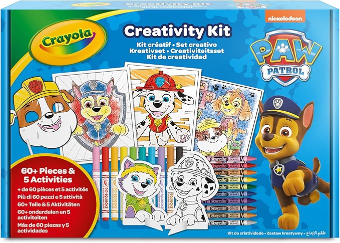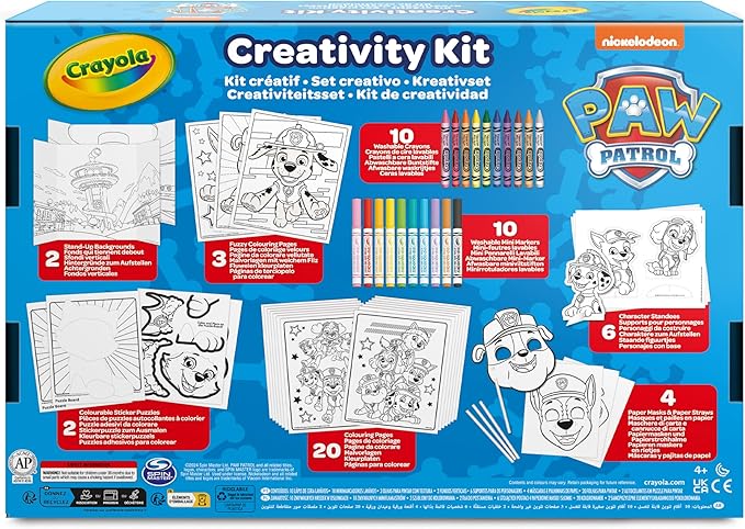 • UN COFANETTO RICCO di attività creative tematizzate con i personaggi della mitica squadra Paw Patrol che contiene: 10 mini pennarelli lavabili, 10 pastelli a cera, 20 pagine da colorare, 3 pagine da colorare vellutate, 2 puzzle adesivi colorabili, 2 sfondi da costruire e colorare, 6 personaggi pop-up, 4 maschere di carta