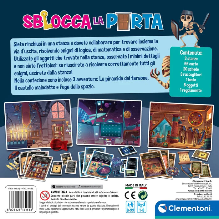 Come in un'escape room, i bambini dovranno riuscire a risolvere gli enigmi di 3 diverse avventure ambientate rispettivamente nello spazio, nella tomba del faraone e in un castello.