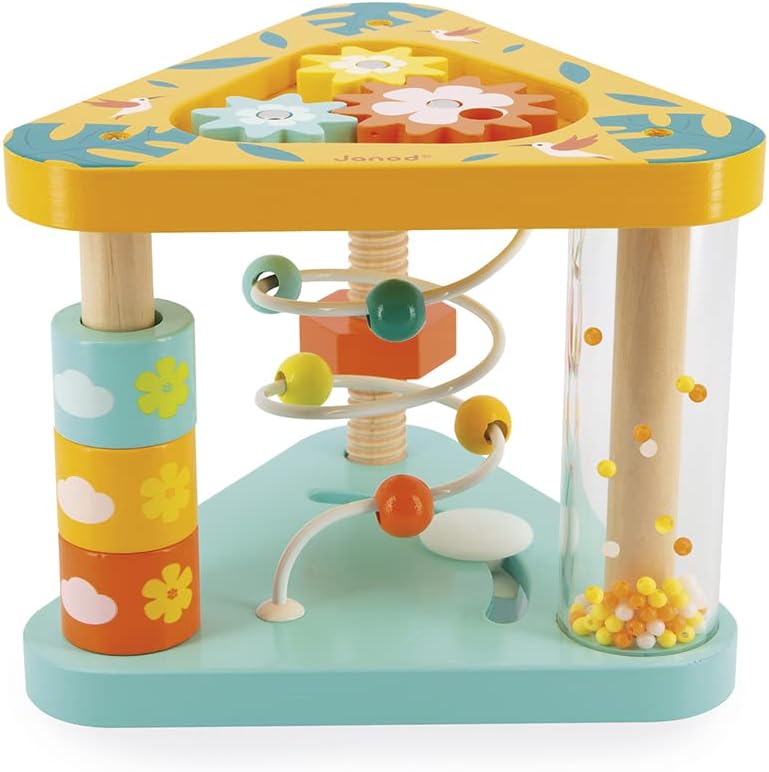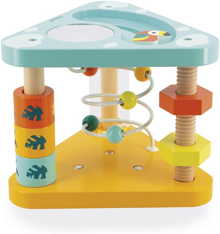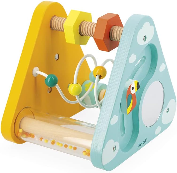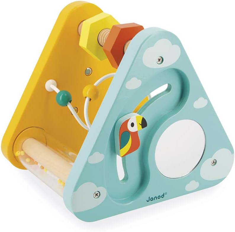 - MOLTEPLICI ATTIVITÀ: compatto e facile da trasportare, questo triangolo tutto-in-uno comprende ben 7 attività ideali per favorire le prime manipolazioni: labirinto, specchio, ingranaggi, dadi, pallottoliere, bastone della pioggia, cilindri da allineare... ce n'è per tutti i gusti, tutti i sensi e tutti gli stati d'animo!