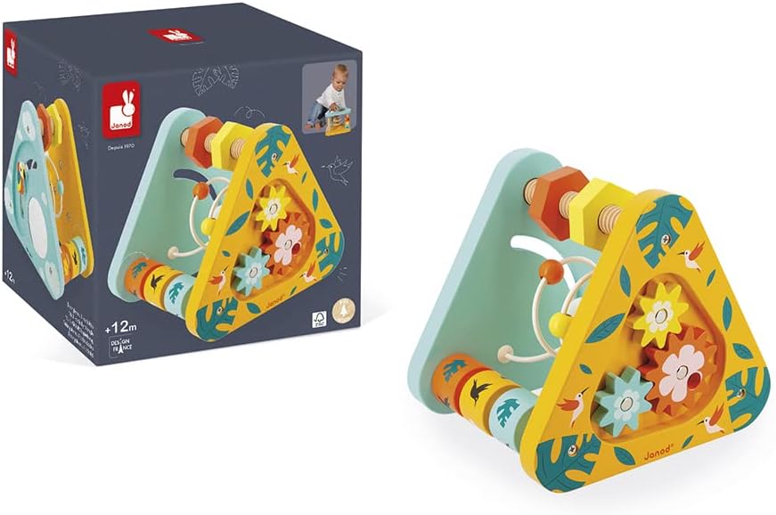 - CARATTERISTICHE : Contiene un supporto triangolare e 7 attività. Dimensioni del giocattolo : Lunghezza 19,8 cm x Larghezza 18 cm x Altezza 15,8 cm. Materiale(i) utilizzato(i) : Legno (compensato, MDF, tiglio), metallo, plastica. Fascia d'età consigliata : da 12 mesi a 36 mesi.