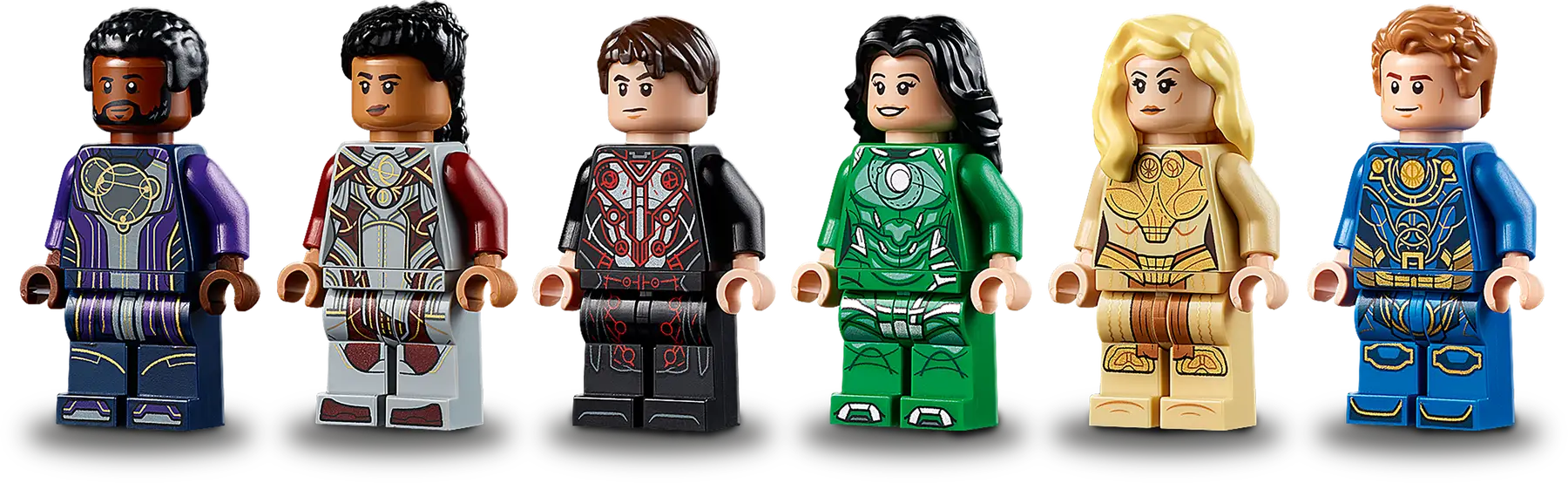 - Il set include 6 minifigure di Makkari, Ikaris, Thena, Sersi e gli esclusivi Druig e Phastos, 2 personaggi d’azione dei Deviant, tra cui Kro, il leader dei Deviant, un’astronave, armi e accessori.