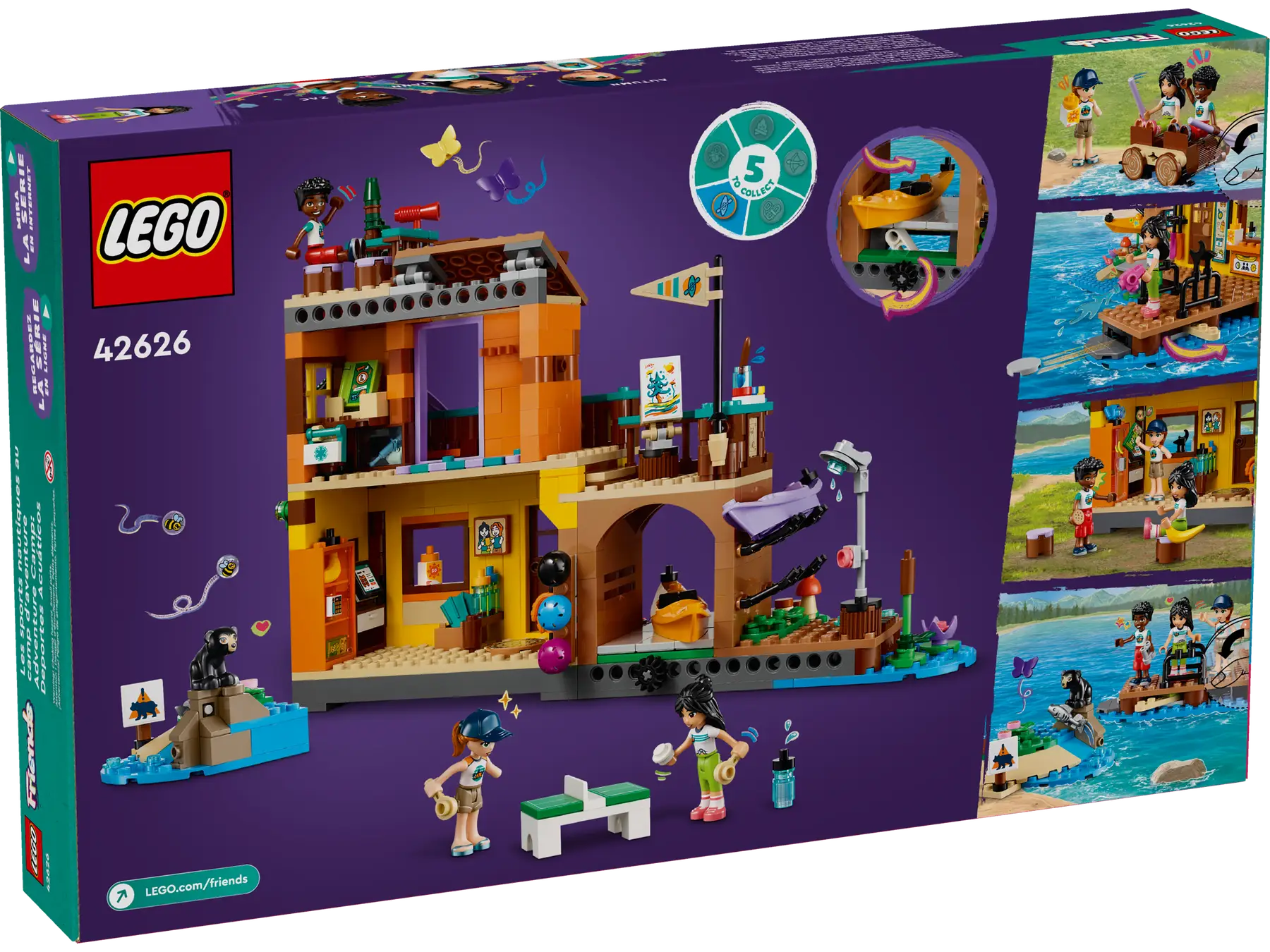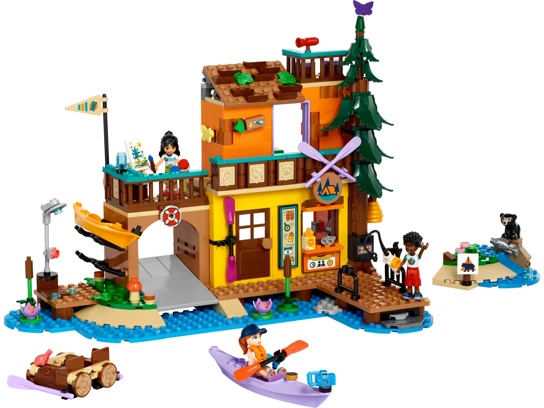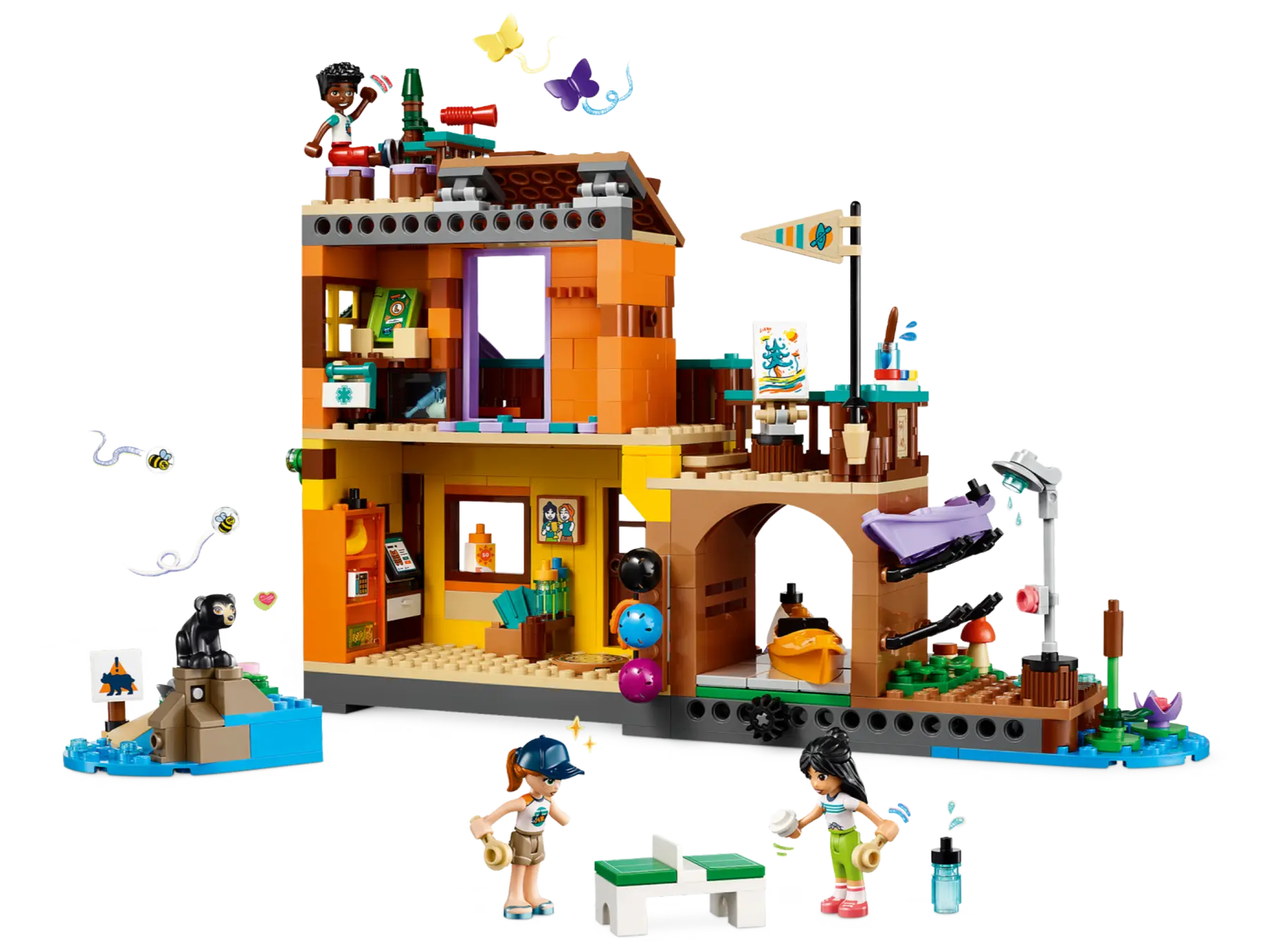 Questo set LEGO Friends è ricco di accessori per infinite possibilità di narrazione di storie. All’interno del campo avventure puoi noleggiare l’attrezzatura, un frigorifero con snack, una doccia, un kit di pronto soccorso, trofei e altro ancora. Dopo una giornata piena di divertimento, gli amici possono incontrarsi nella zona comune o fare una partita a ping pong.