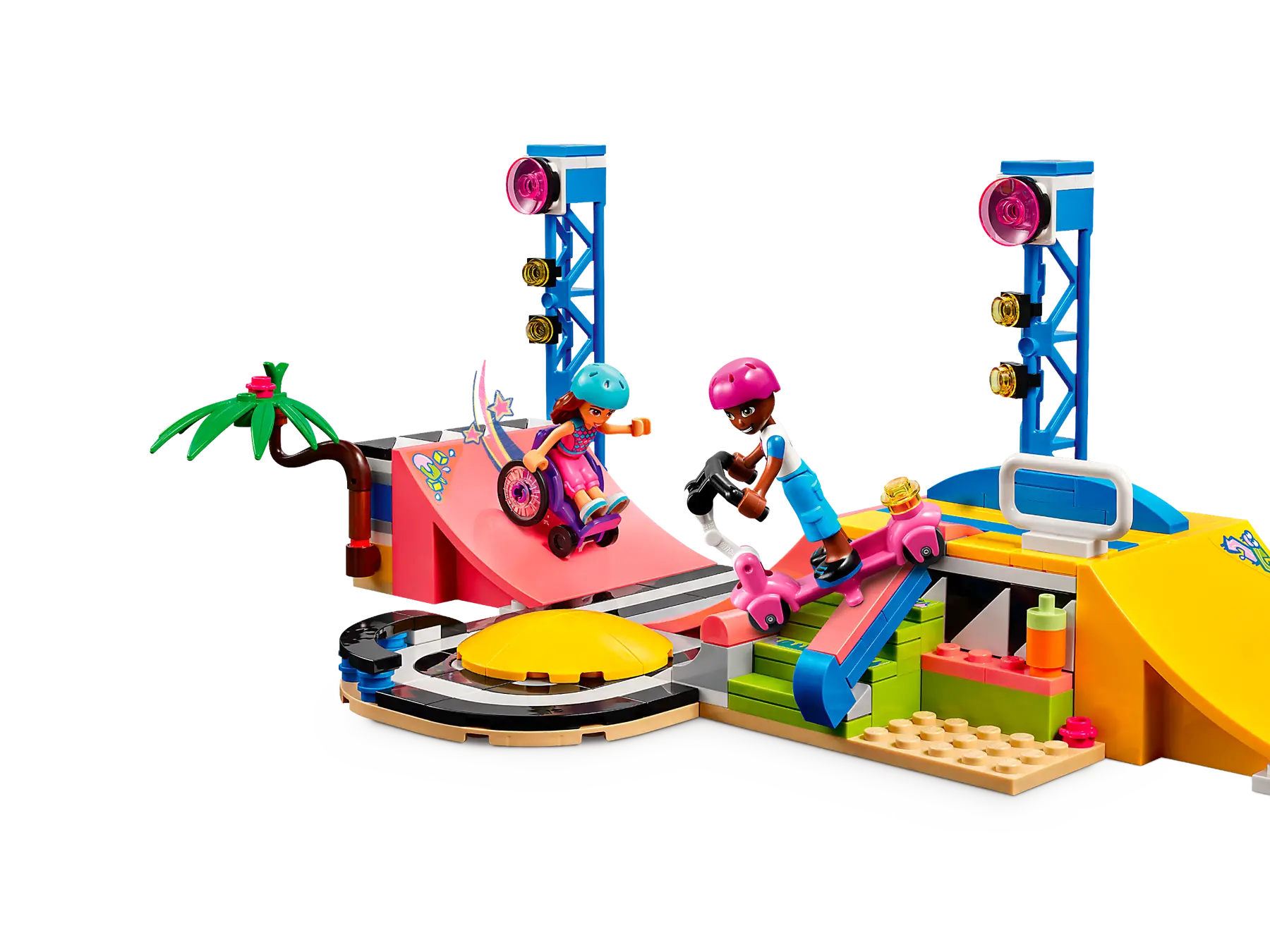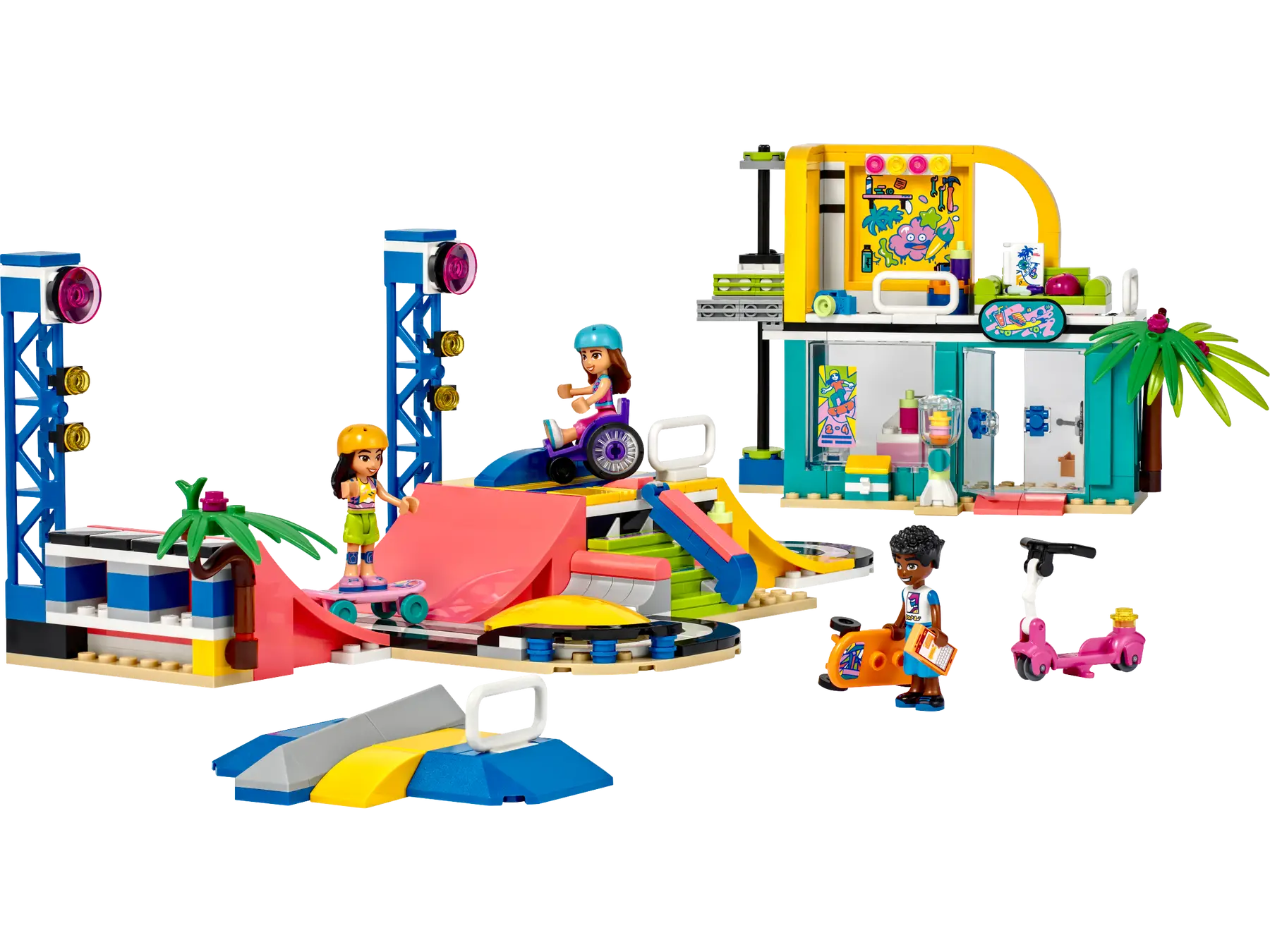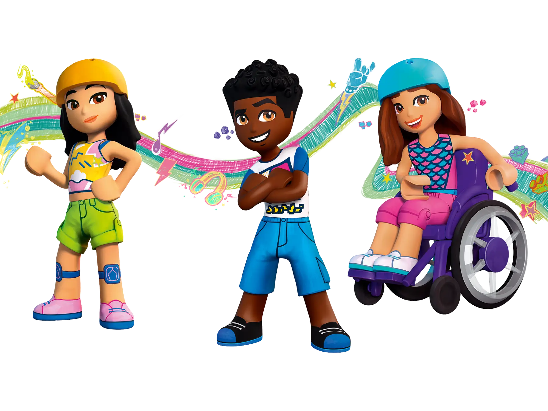 • 3 mini-doll e accessori: il set contiene i personaggi LEGO® Friends di Liann, Zac e Luna, rampe, rail, pattini in linea, skateboard, monopattino, la sedia a rotelle di Luna e i caschi di ogni personaggio