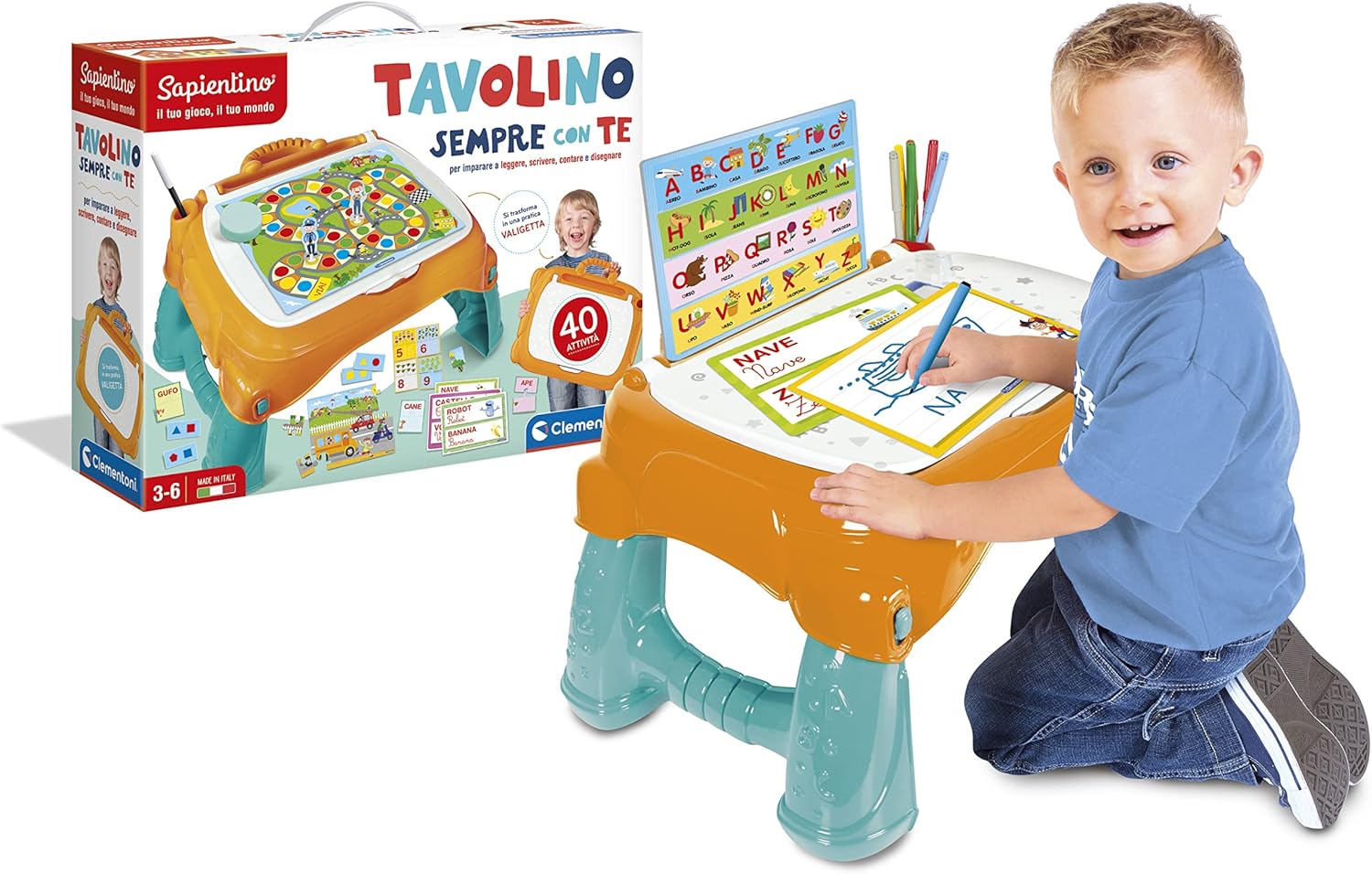 - TAVOLINO SEMPRE CON TE: un tavolino interattivo completo di attività educative per imparare a scrivere, leggere, contare e disegnare, con tanti giochi di associazione e schede colorate; stimola la creatività e l'apprendimento dei più piccoli
