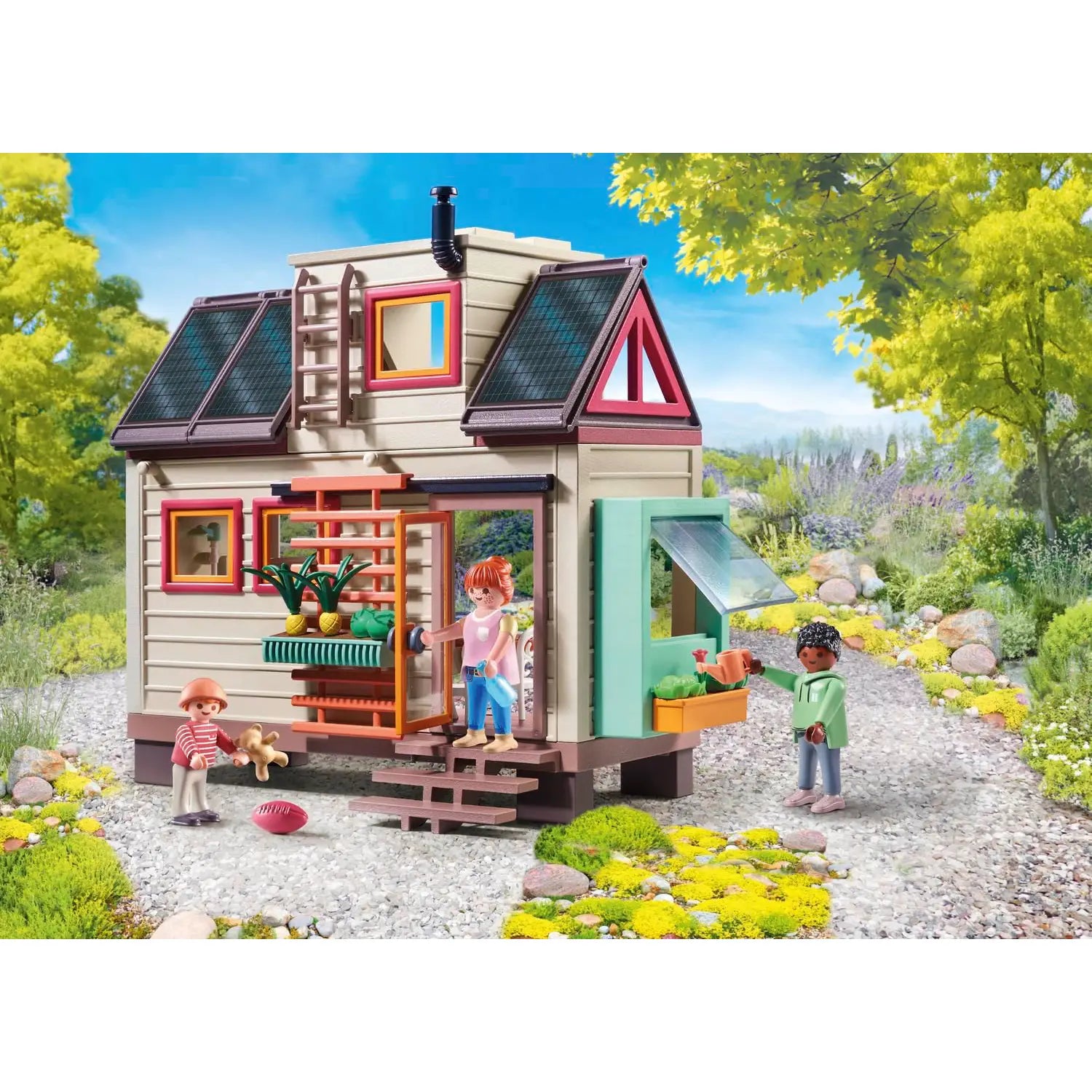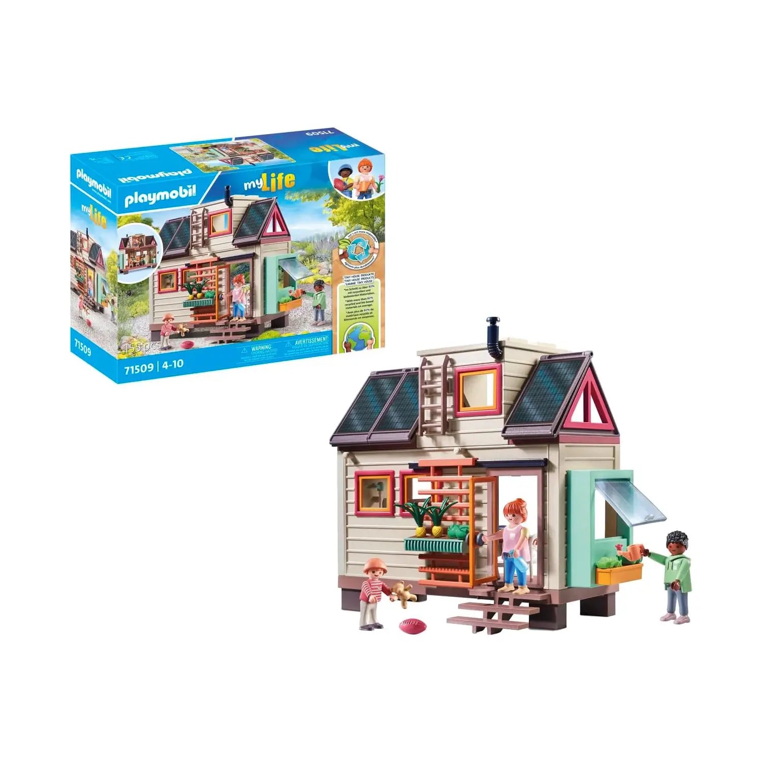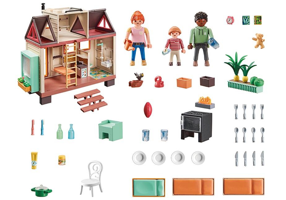 Questa Casa eco-sostenibile si sviluppa su due piani con un'accogliente cucina-soggiorno, letti singoli e arredi funzionali. Può essere personalizzata in qualsiasi momento con modelli di carta da parati da scaricare, stampare e attaccare. Una piccola casa, ma tanto divertimento in famiglia per un mondo sostenibile. Trasferisciti nel tuo piccolo rifugio familiare con il mondo della Casa eco-sostenibile di PLAYMOBIL. La Casa eco-sostenibile offre tutto ciò che il tuo cuore desidera: al piano inferiore, c'è la zona pranzo e cucina con fornello, lavandino e frigorifero, oltre a un tavolo pieghevole e il bagno con doccia e servizi igienici. La scala pieghevole conduce fino alla soffitta. Qui si trovano una camera per bambini e due posti letto per adulti. All'esterno, un giardino verticale e una fioriera consentono di coltivare frutta e verdura per uso personale e i pannelli solari sul tetto sostengono l'alimentazione elettrica. Questa piccola casa non lascia desideri insoddisfatti!