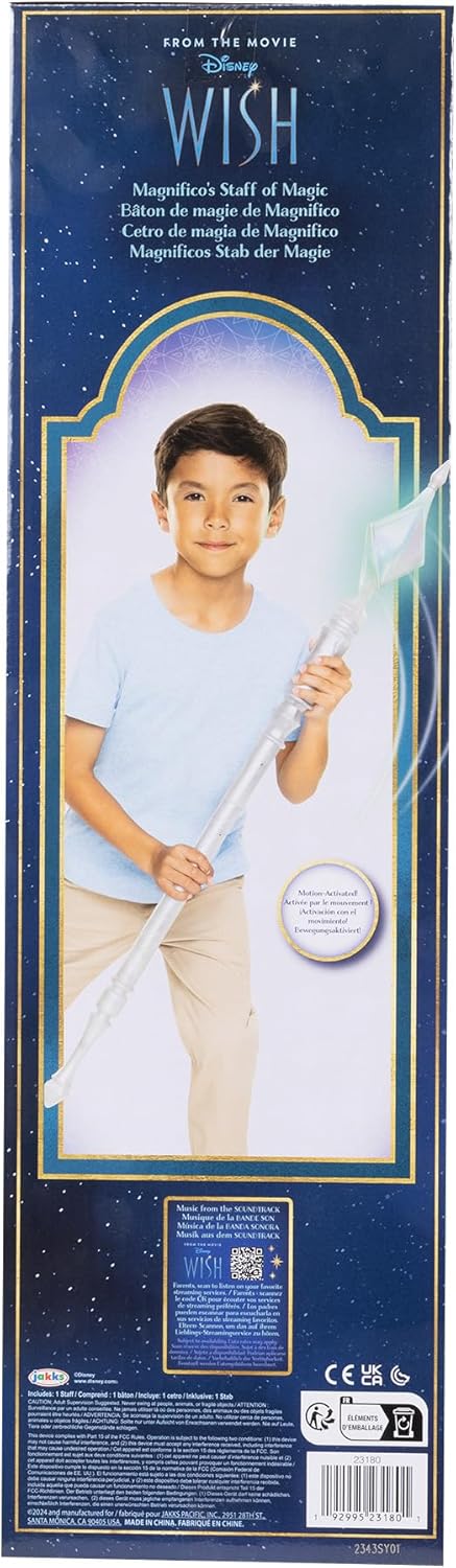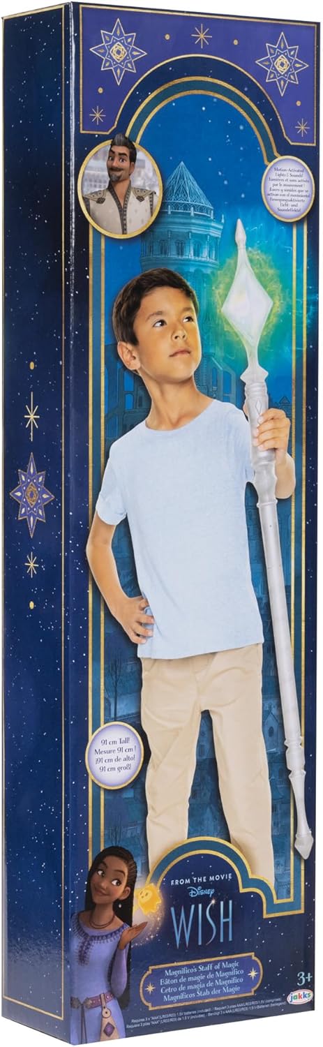 Esplora il mondo magico con l'asta della magia di Wish Magnifico's. Lunga 91 cm, si illumina e produce suoni magici. Regala avventure Disney e credi nei desideri con questa bacchetta luminosa. Perfetta come regalo di compleanno o Natale. Adatta dai 3 anni, include 3 batterie LR44.