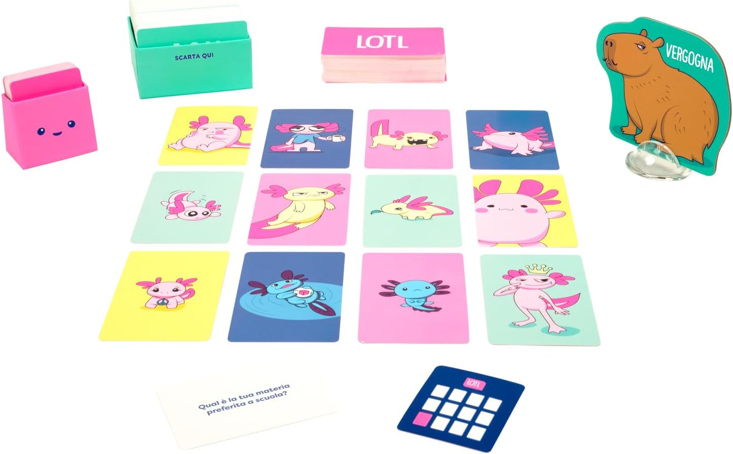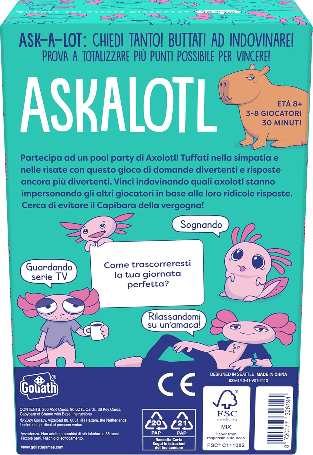 - UN GIOCO DIVERTENTE CON ADORABILI AXOLOTL: Immergiti in un mondo colorato e spensierato con Askalotl, un gioco da tavolo unico che trasforma ogni partita in un'esplosione di risate e sorprese! Rispondi a domande esilaranti, indovina quale risposta appartiene a chi e colleziona carte per vincere. Perfetto per animare serate in famiglia o con gli amici.