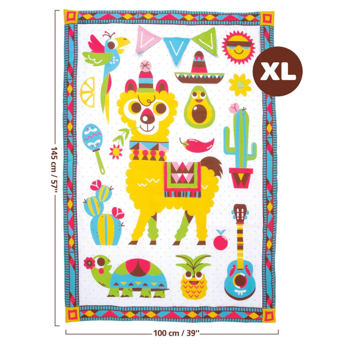 Un tappetone multi attività extra-large (145X100 cm) con imbottitura spessa e morbida. Si piega diventando una borsa con all’interno il tappetone stesso e i giocattoli!