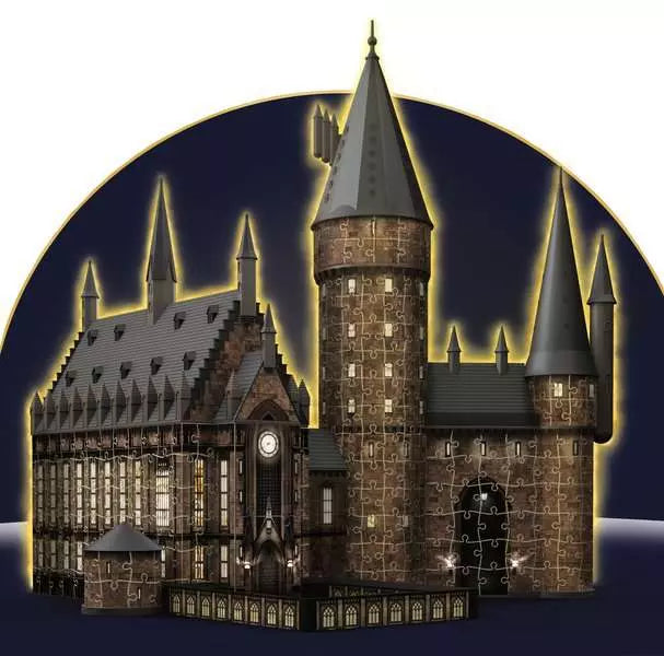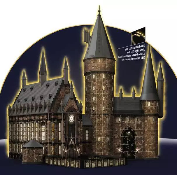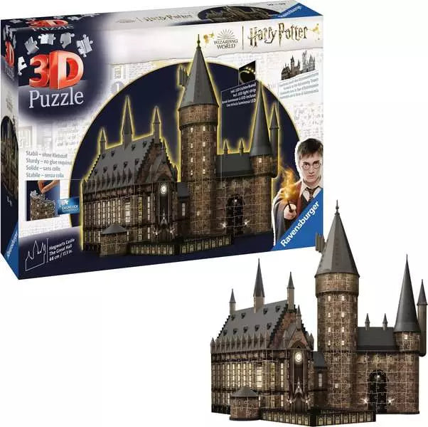 I fan di Harry Potter di tutte le età possono costruire pezzo per pezzo il puzzle 3D illuminato della Sala Grande Ravensburger utilizzando 540 pezzi di plastica di alta qualità e una serie di accessori.