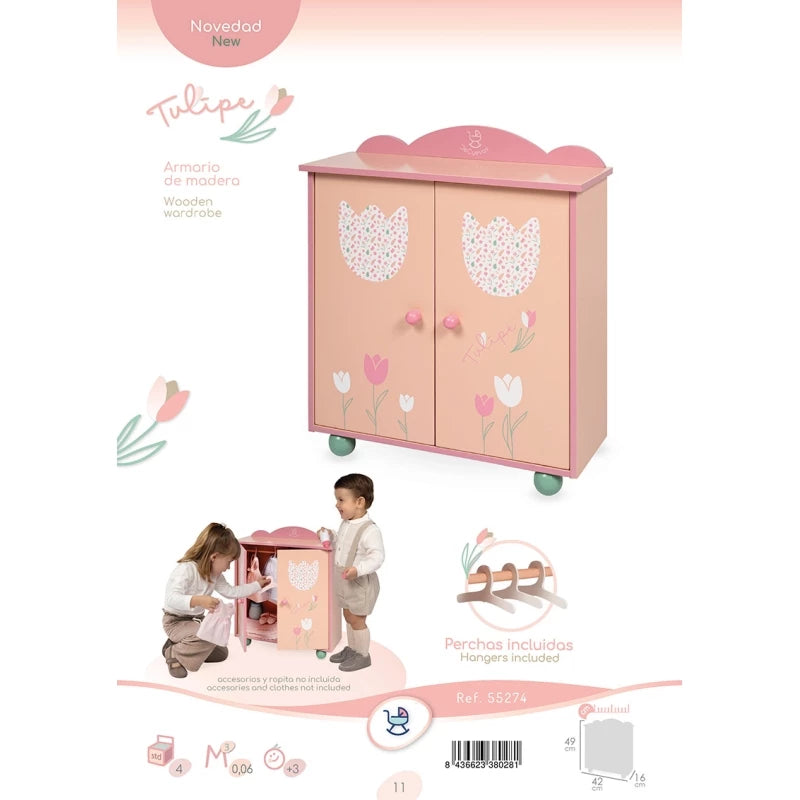 Include: 1 armadio in legno per bambole con serigrafia del design speciale della linea Tulipe rosa, due porte a battente, tre grucce in legno e tanti altri dettagli di lusso.