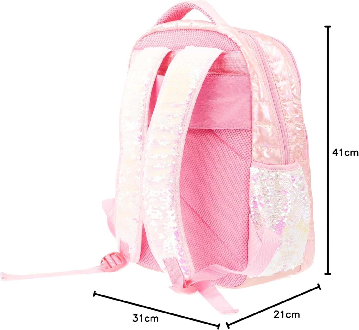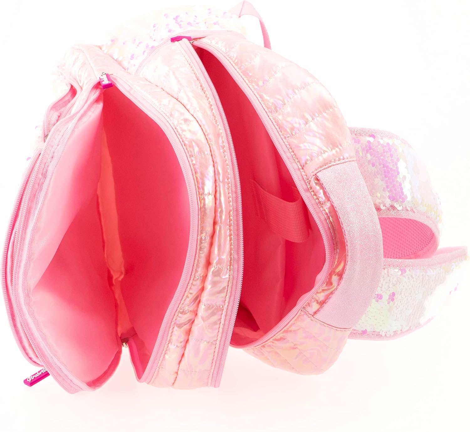 - GIRABRILLA PUFFER SCHOOL BAG: zaino per la scuola dai colori cangianti, con tasche in paillettes reversibili, realizzato con materiali di qualità morbidi al tatto. Disponibile nella variante con colore bianco perlescente e maniglie coordinate di tessuto glitterato.