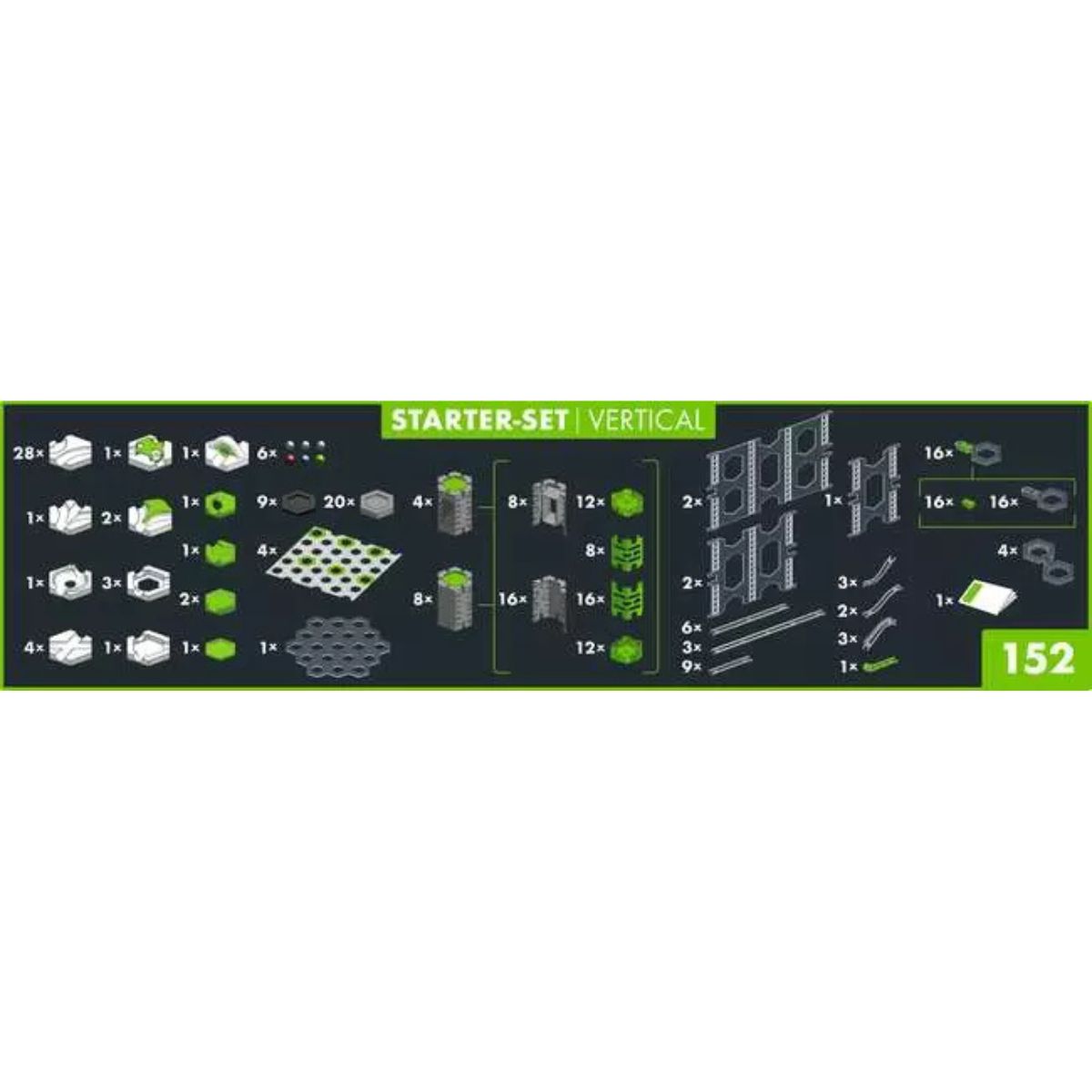 - Contiene: Manuale d’istruzioni, progetto di costruzione, 4 elementi base, 1 base trasparente, 6 biglie, 12 blocchi verticali, 2 pannelli lunghi trasparenti, 2 pannelli medi trasparenti, 1 pannello corto trasparente, 16 ponti singoli, 4 ponti doppi, 8 binari Bernoulli di plastica corti, 3 binari di plastica lunghi, 6 binari di plastica medi, 9 binari di plastica corti, 20 blocchi grandi, 9 blocchi piccoli, 28 elementi curvi, 4 incroci, 2 scambi, 1 elemento 3 in 1, 1 vortice, 1 elemento di partenza, 1 cannone Gauss, 1 elemento d’arrivo, 4 elementi base con 2 catcher, 1 cascata libera, 1 splash, 1 bersaglio.