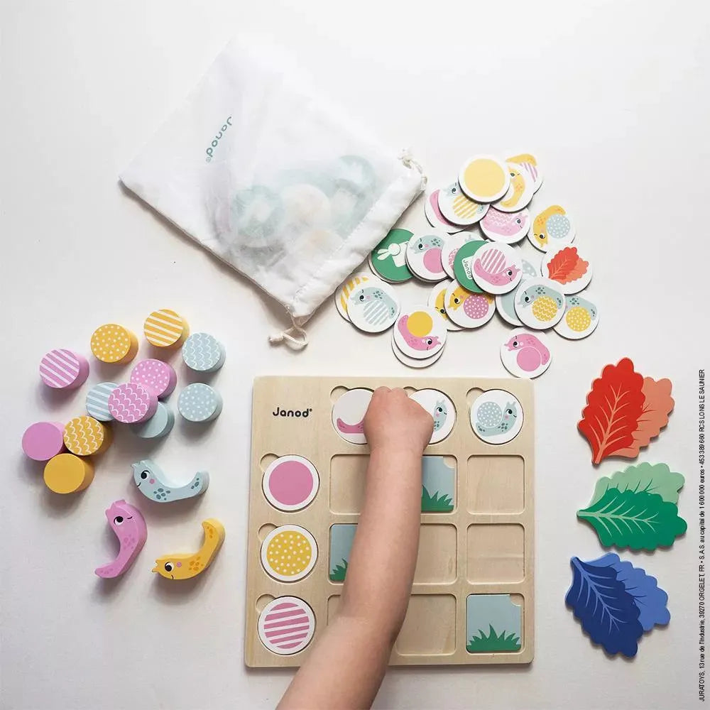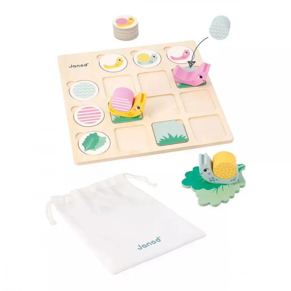 54 gettoni, 3 carte quadrate con l'erba, 3 corpi di chiocciola, 12 gusci e 3 foglie di insalata consentono infinite possibilità di gioco! È inclusa anche una pratica borsa in cotone per non perdere alcun pezzo al termine del gioco. Il libretto di istruzioni incluso permetterà di usare al meglio questo gioco rivolto ai bambini del secondo anno della scuola materna. Questo gioco fa parte di una collezione pedagogica sviluppata in collaborazione con un'insegnante di scuola materna affinché sia aderente ai programmi educativi di ciascun livello. È fabbricato in legno e cartone FSC®.