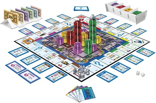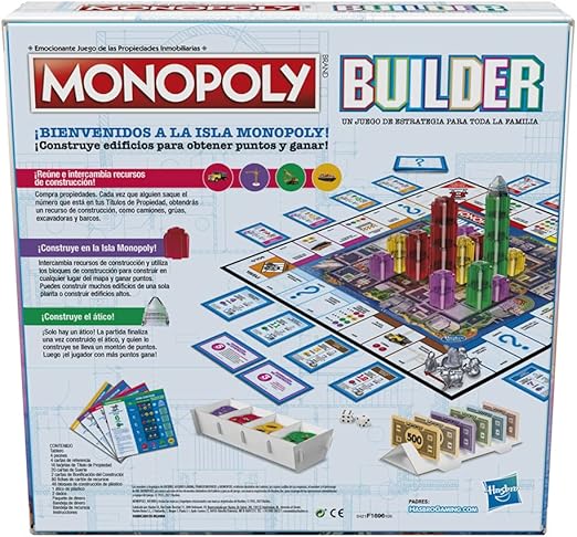 Si tratta del gioco Monopoly, ma con un tocco diverso dato dall’Isola di Monopoly posizionata al centro del tabellone. Con il gioco di strategia Monopoly Builder, i giocatori si spostano lungo il tabellone acquistando proprietà e riscuotendo affitto e risorse. Inoltre, utilizzano i blocchi da costruzione per costruire una città sull’isola! Più un giocatore costruisce, più punti guadagna. La partita termina quando viene costruita la penthouse. Vince il giocatore che ha più punti al termine della partita! Il gioco di società è ideato per 2-4 giocatori dagli 8 anni in su ed è un gioco molto divertente.