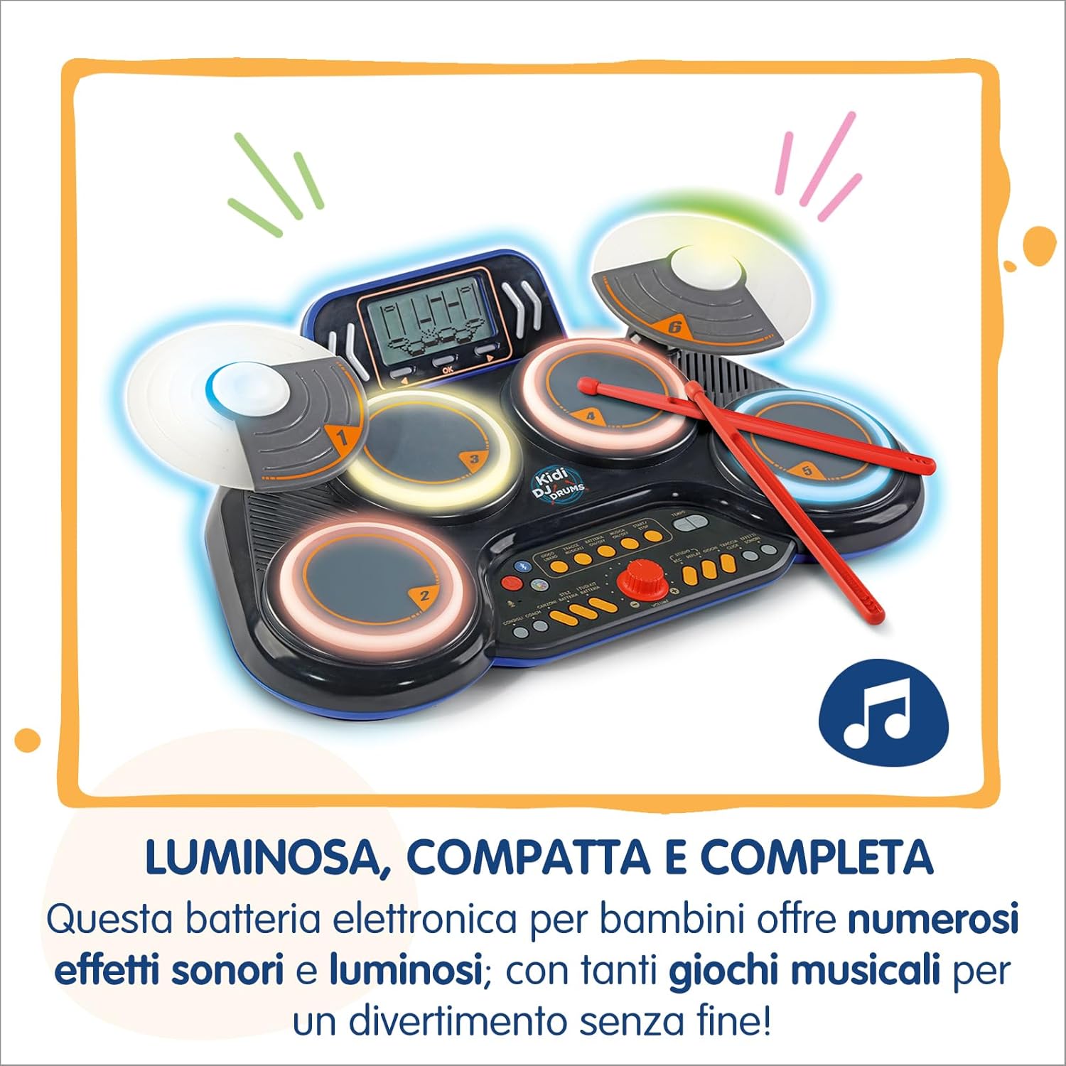- DIVERTIMENTO ASSICURATO: compatta e completa, questa batteria elettronica per bambini offre numerosi effetti sonori e giochi musicali per un divertimento senza fine