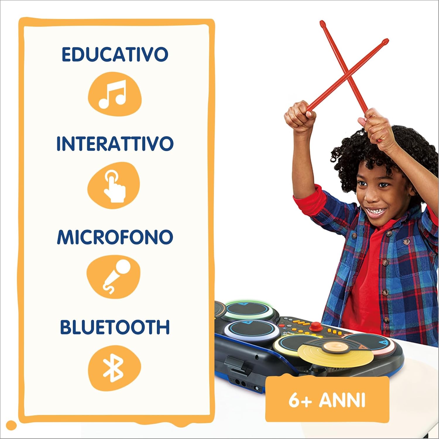 - PAD LUMINOSI: 4 pad luminosi, 2 piatti e una zona di controllo permettono al bambino di mixare composizioni musicali e attivare suoni realistici come una vera batteria